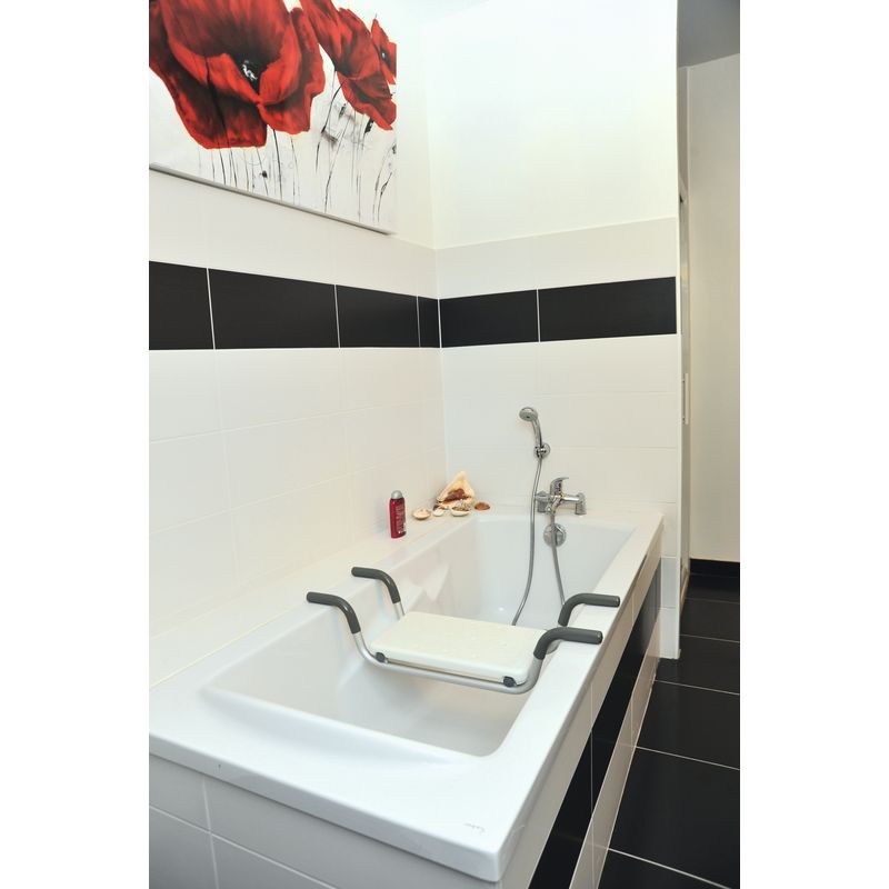 - Asiento de bañera quer se apoya en los bordes de su bañera y le permite sentarse cómodamente durante el baño.