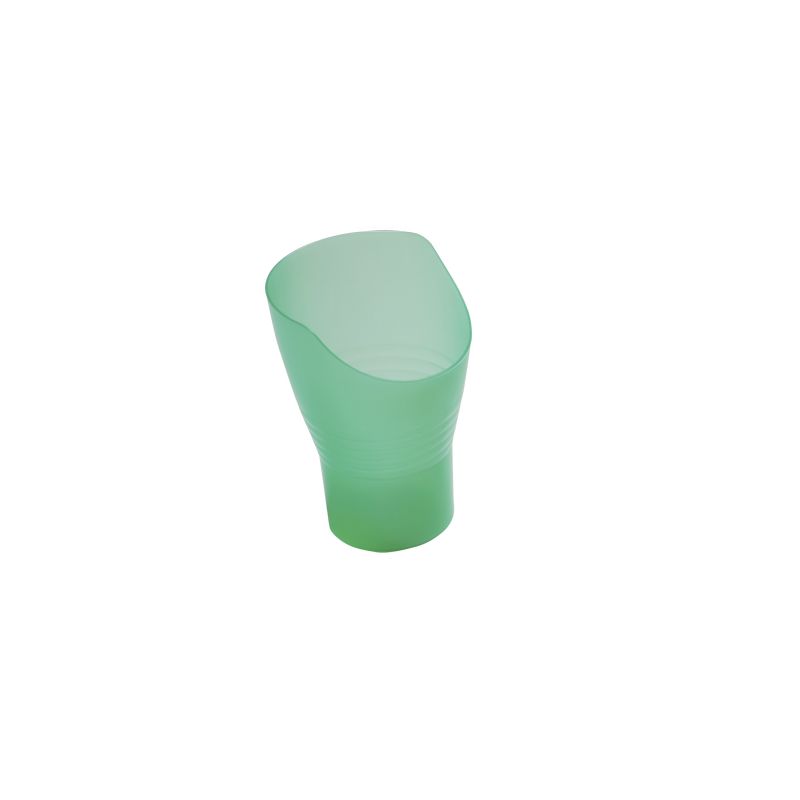 - Con este vaso adaptado puedes beber mientras mantienes la cabeza recta gracias a su gran corte especial que permite que la nariz pase.